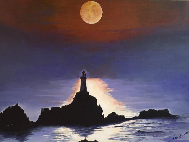 Lighthouse At Night Silhouette Landscape Large Signed Oil Painting