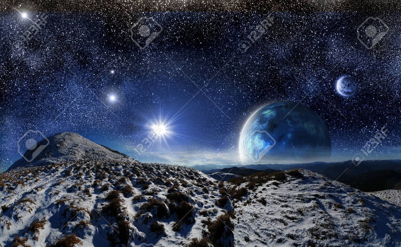 Night Mountain Landscape On A Background Of Outer Space And Two