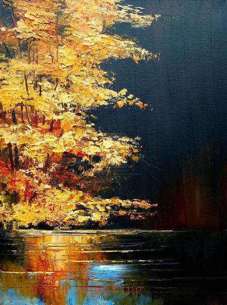 Handmade Amazing Art Knife Oil Paintings On Canvas Gold Yellow Tones Combined Such Light Bloom Tree Landscape Hang On The Wall Random Cheap Gifts