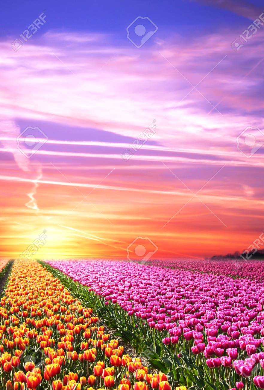 Incredibly Beautiful Spring Landscape With Rows Of Tulips In