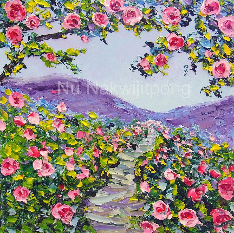Original Landscape Rose Oil Painting Fairy Rose Garden Hills Mountain Palette Knife Impasto 8x8 Small Canvas Ready To Hang